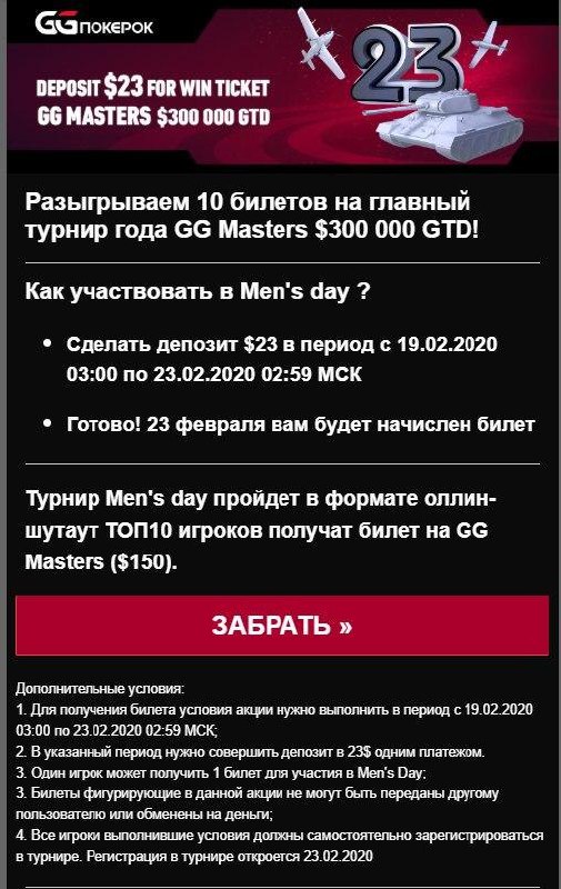 Каждое воскресенье в 19:00 на GGПокерОК проходит GG Masters - флагманский турнир сети с бай-ином $150 и гарантией $300,000. На этой неделе сеть разыгрывает 10 билетов в сателлите Men's Day. Участие открыто для всех, кто сделает депозит не менее $23 до 02:59 воскресенья по Москве.