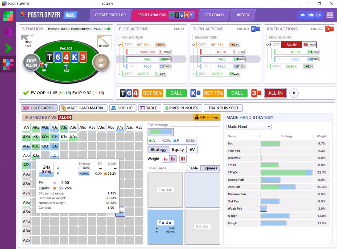 👌 Машина чекает на месте Продиджи в 63% случаев. Оптимальный сайзинг для ставки в остальных случаях — 2/3 пота. Его диапазон уже несколько поляризован, так что ставит машина в основном с трипсами (и лучше), а в блеф идут дро.