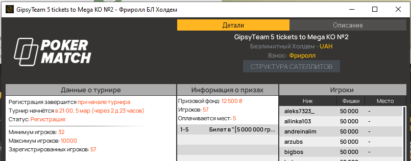 Для всех игроков, зарегистрированных на PokerMatch от GipsyTeam, мы подготовили небольшой подарок: фриролл с 5 билетами на турнир и еще 20 призами с сателлитами.