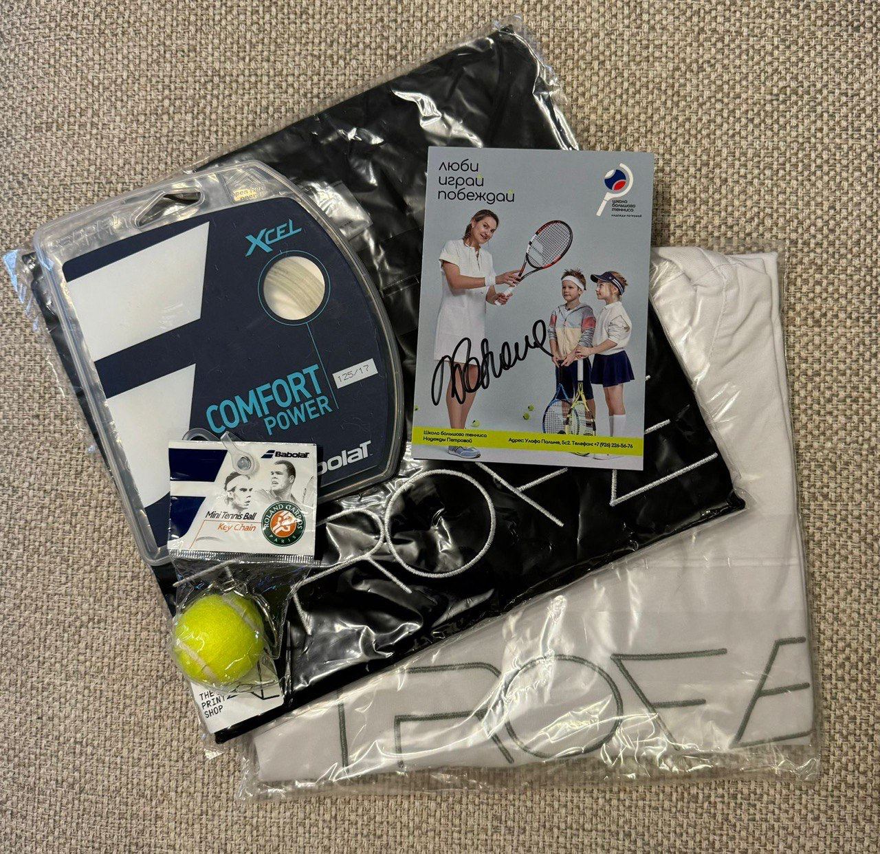 первый победитель получит футболку Trofe, теннисный мяч Babolat и карточку с моим автографом; второй — футболку Trofe и теннисную струну Babolat Xcel.