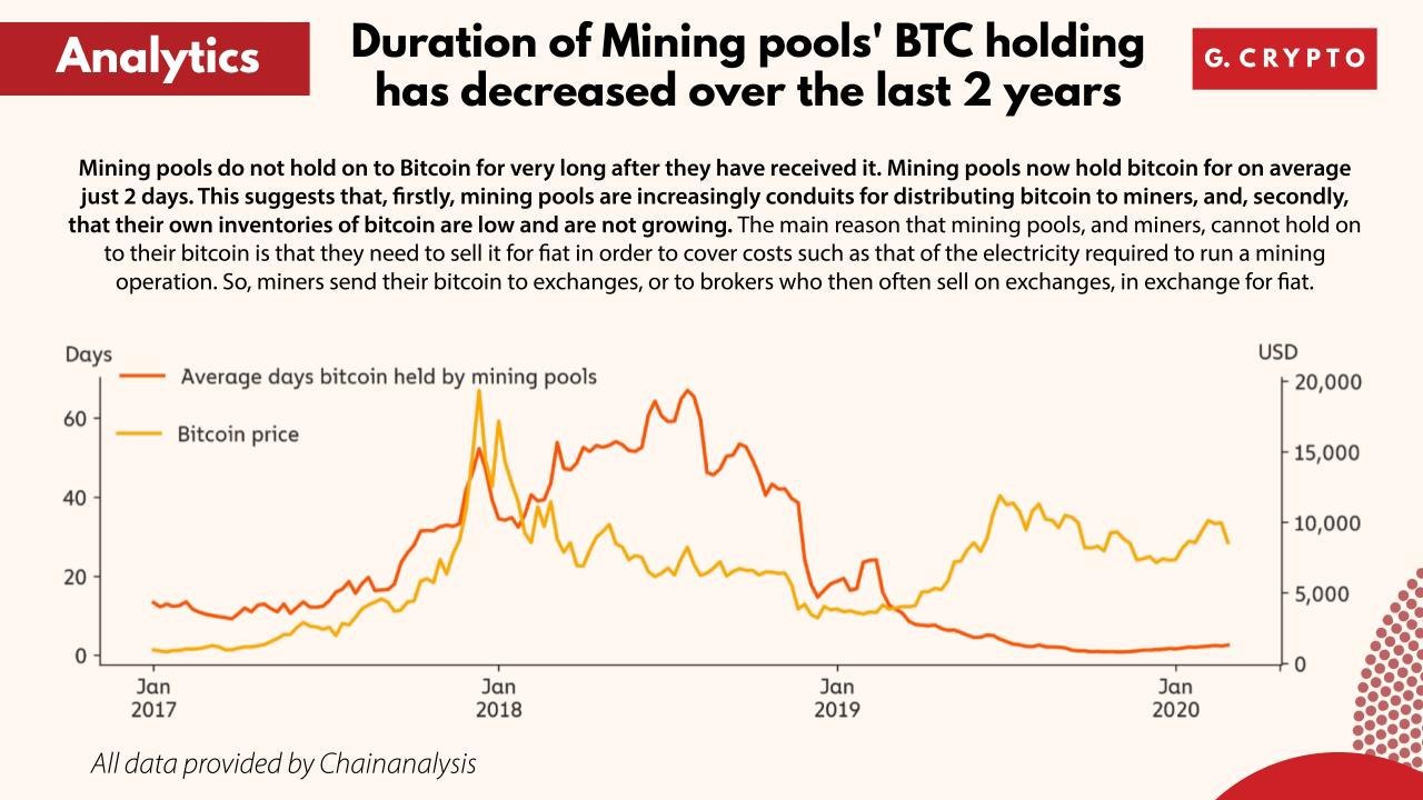 Duration of Mining pools' BTC holding has decreased over the last 2 years