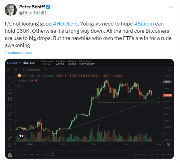 🥸 Питер Шифф — известный сторонник инвестиций в золото и противник криптовалют предупреждает "новичков" инвестирующих в Биткоин ETF о неприятном пробуждении.