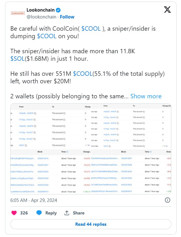 Также стало известно, что 5 адресов продали 22,81 млн $COOL за 11 896 $SOL ($1,69 млн).