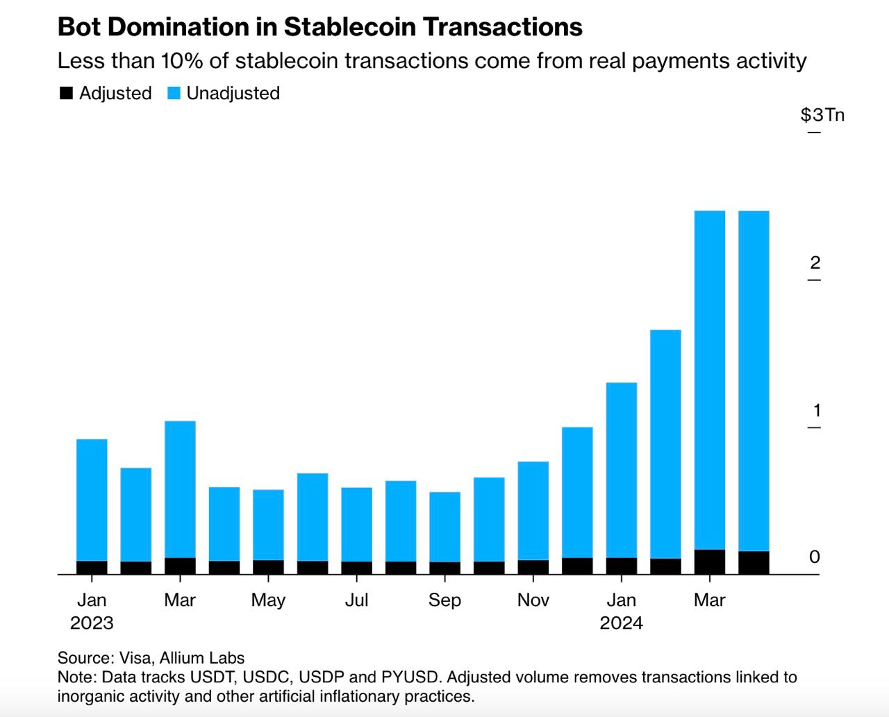 Согласно новому исследованию Visa, более 90% объемов транзакций стейблкоинов совершается ботами. Это говорит о том, что такие криптотокены еще далеки от того, чтобы стать широко используемым средством платежа.