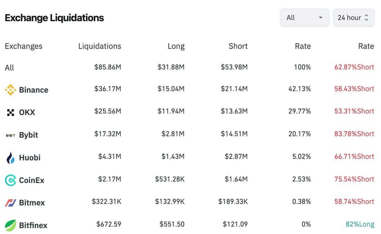 Крупнейшая сумма ликвидаций была зафиксирована на бирже Binance — $36,17 млн.