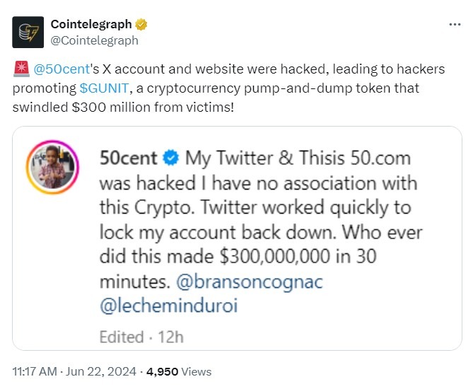 Рэпер Кертис Джеймс Джексон III, более известный как 50 Cent, заявил, что его социальные сети были взломаны. Через его аккаунты хакеры активно продвигали токен GUNIT, который привлёк более $300 млн.