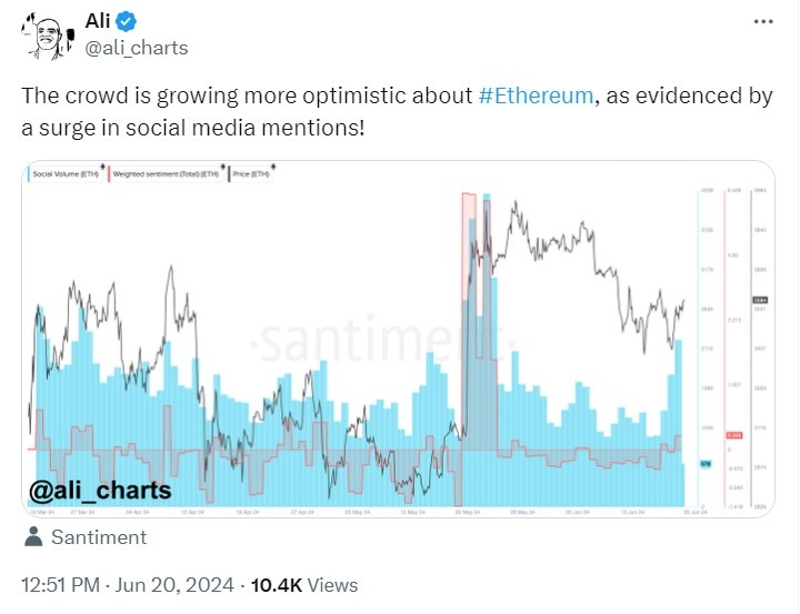 Трейдер под ником ali_charts отметил, что об этом свидетельствует всплеск упоминаний актива в социальных сетях.