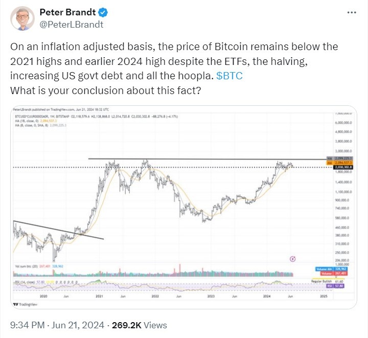 С поправкой на инфляцию цена биткоина остаётся ниже максимумов 2021 года и более раннего максимума 2024 года, несмотря на ETF, халвинг, растущий государственный долг США и всю эту шумиху.
