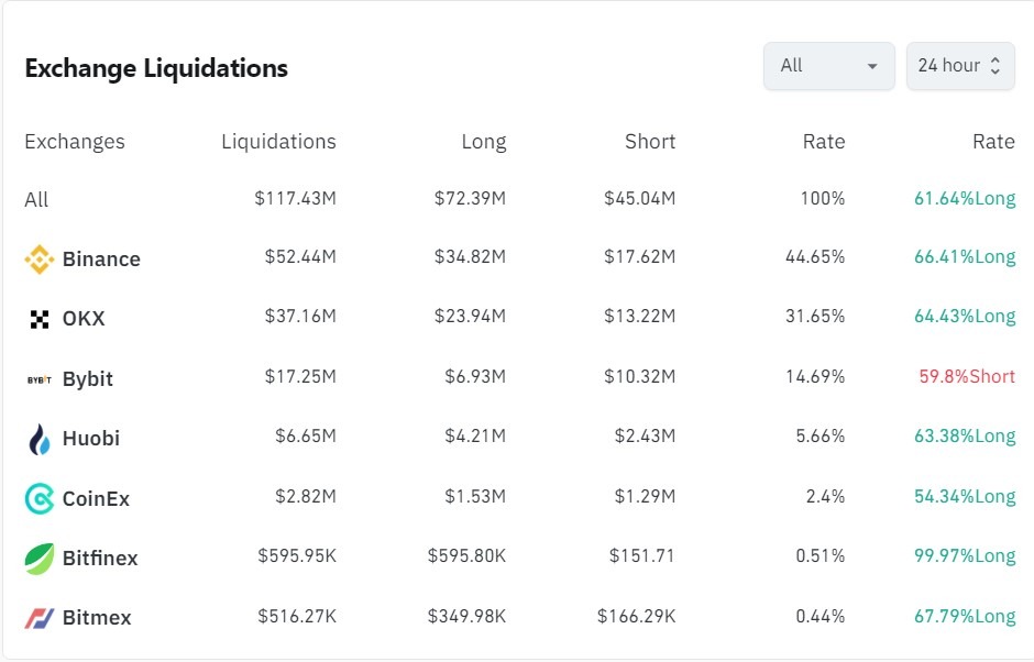 За последние 24 часа было ликвидировано 50 788 позиций трейдеров, общая сумма ликвидаций составила $117,43 млн.