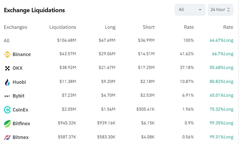 За последние 24 часа было ликвидировано 42 043 позиций трейдеров, общая сумма ликвидаций составила $105,15 млн.