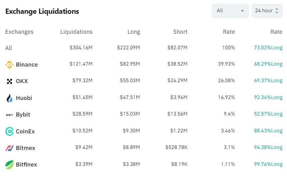 За последние 24 часа было ликвидировано 67 163 позиции трейдеров, общая сумма ликвидаций составила $304,19 млн.