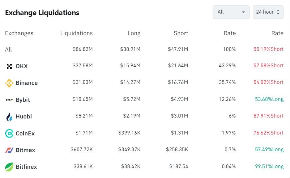 За последние 24 часа было ликвидировано 32 972 позиции трейдеров, общая сумма ликвидаций составила $86,79 млн.