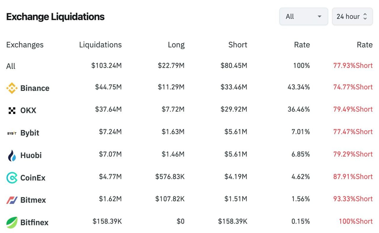 За последние 24 часа было ликвидировано 31 696 позиции трейдеров, общая сумма ликвидаций составила $103,43 млн.