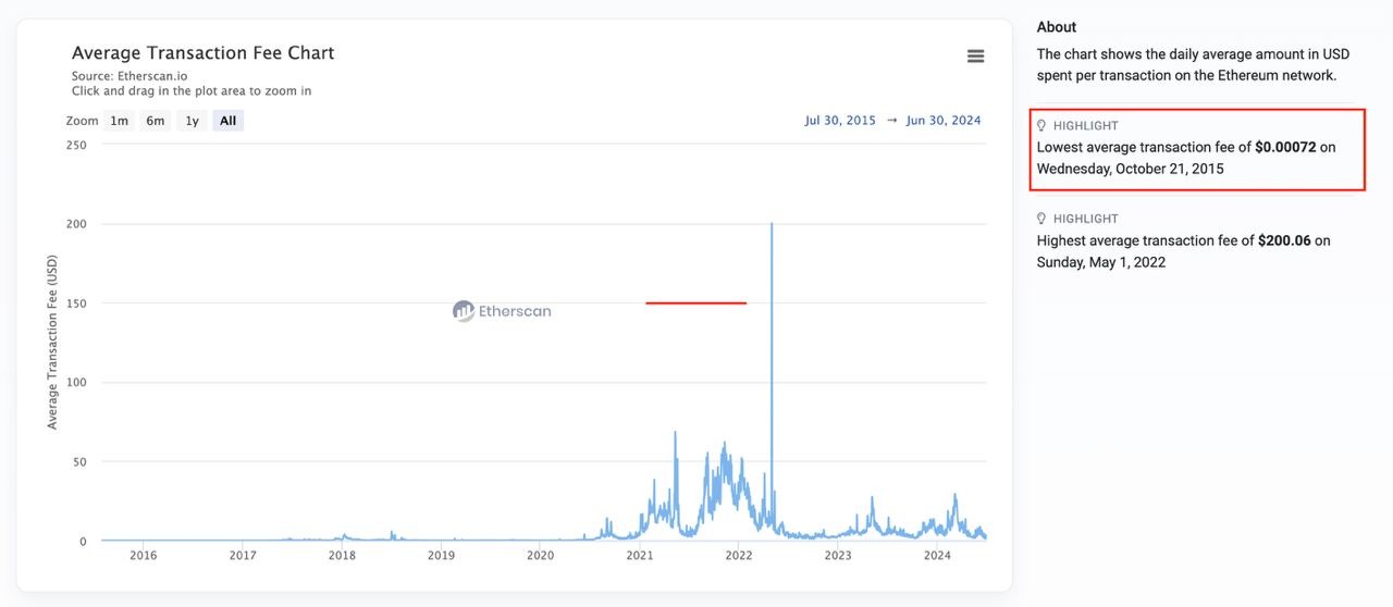 Какая была самая низкая средняя комиссия за транзакцию Ethereum в истории?