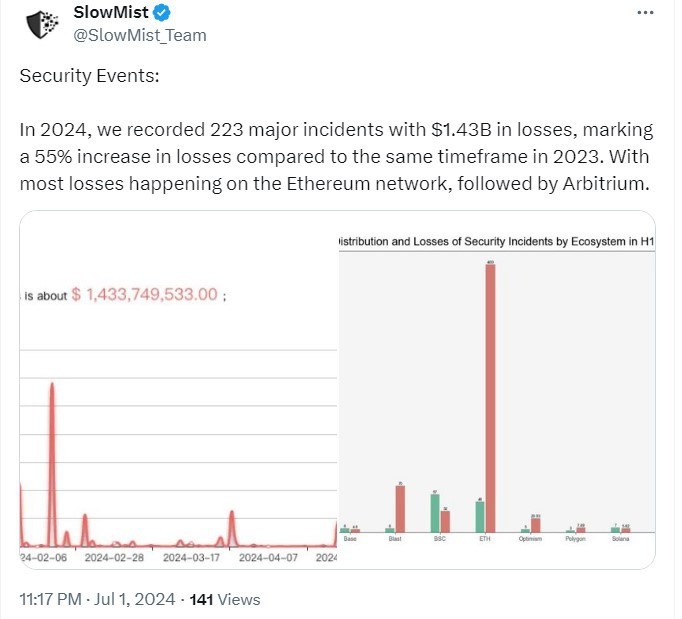 Хакеры украли цифровых активов на сумму около $1,43 млрд. Этот показатель на 55% больше по сравнению с аналогичным периодом 2023 года