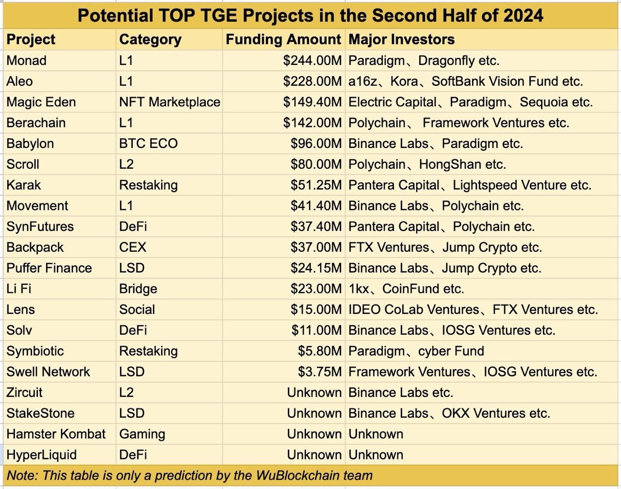 Среди них оказались Monad, Aleo, Magic Eden, Berachain, Babylon, Scoll, Karak, Movement, SynFutures, Backpack, Puffer, LiFi, Lens, Solv, Symbiotic, Swell, Zircuit, StakeStone, Hamster Kombat и HyperLiquid.