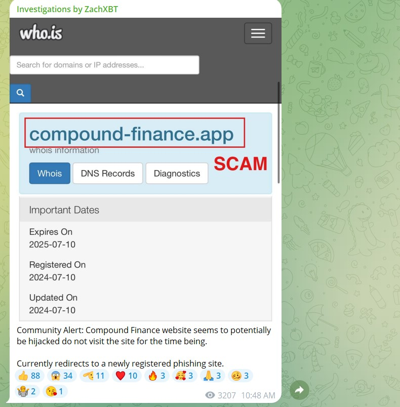 Также член команды Compound Finance Майкл Льюэллен, подтвердил факт взлома и посоветовал пользователям воздержаться от взаимодействия с сайтом, чтобы предотвратить потенциальную потерю персональных данных и средств.