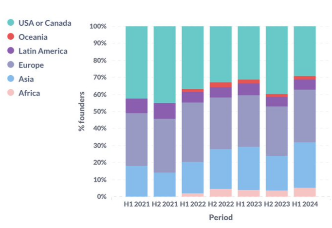 Доля Африки также выросла до 5,2%, что немного ниже доли Латинской Америки, в то время как на долю Океании, в которую в основном входят Австралия и Новая Зеландия, пришлось всего 1,8% от общего числа криптостартапов в первой половине года.