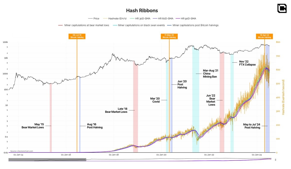 Аналитики прокомментировали диаграмму, на которой указано, что окончание капитуляции майнеров в предыдущих циклах халвинга биткоина сопровождалось резким ростом цены BTC: 5110%, 3346% и 591% роста после капитуляции майнеров в циклах 2012, 2016 и 2020 годов соответственно.