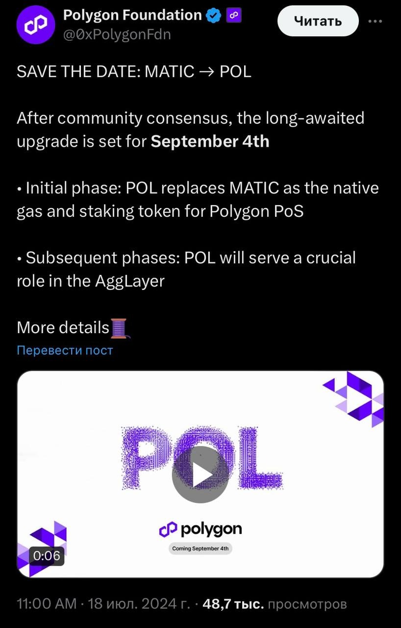 POL будет основным нативным токеном проекта, заменив MATIC.