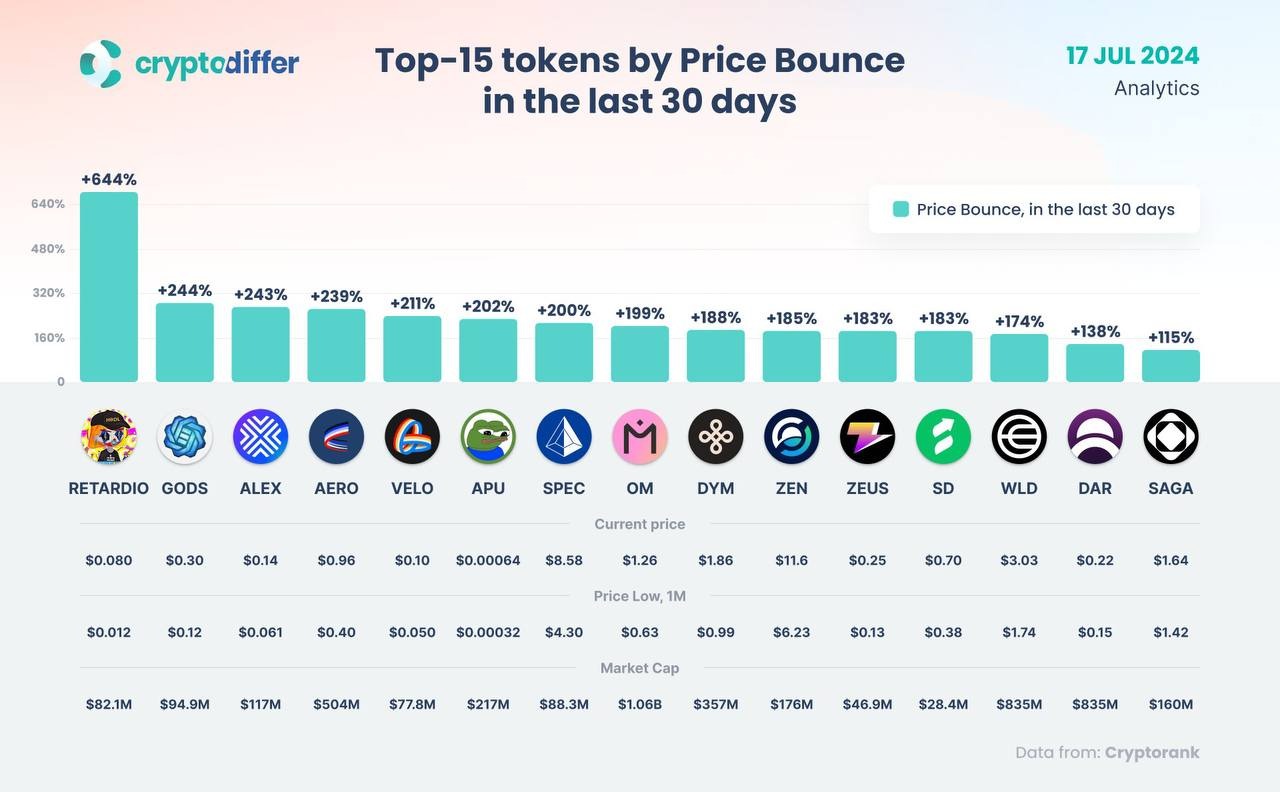 CryptoDiffer представил токены, которые показали наиболее значительный рост от своих минимумов за последние 30 дней.