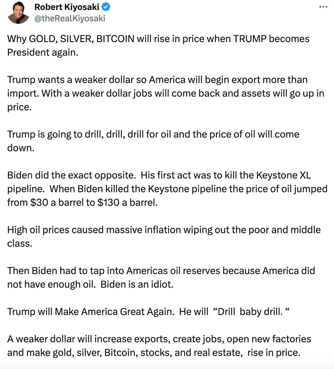 Роберт Кийосаки: Трамп ослабит доллар и укрепит BTC
