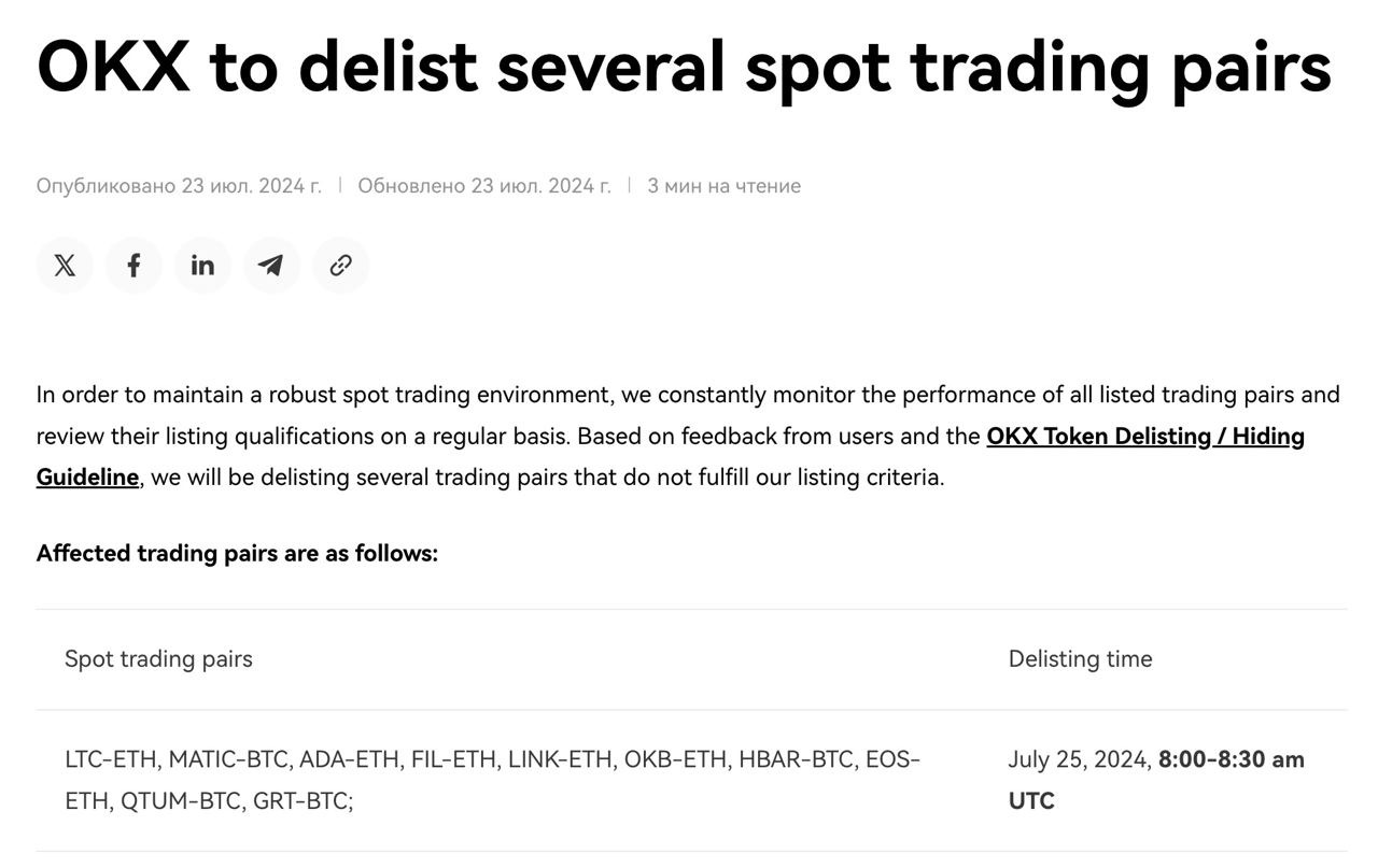 Основываясь на отзывах пользователей и руководстве по удалению токенов OKX из списка, мы исключим из списка несколько торговых пар, которые не соответствуют нашим критериям листинга.