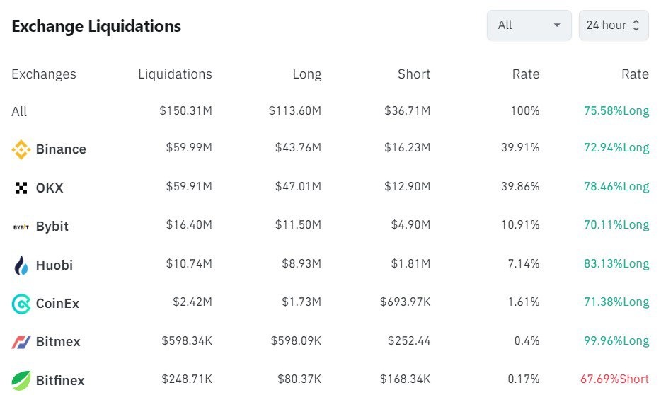 За последние 24 часа было ликвидировано 49 650 позиций трейдеров, общая сумма ликвидаций составила $149,88 млн.