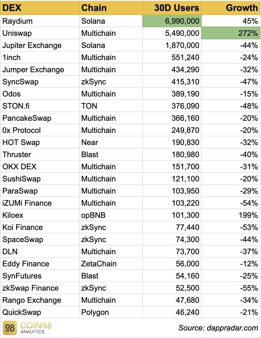 Raydium и Uniswap лидируют по самой высокой статистике относительно активности DEX.