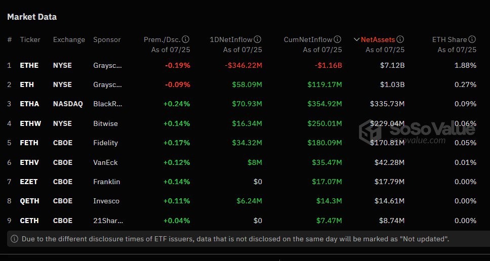 Приток оказался недостаточным, чтобы компенсировать выводы клиентов. BlackRock's iShares Ethereum Trust ETF и Grayscale's Ethereum Mini Trust стали лидерами, привлекая $70,93 млн и $28,09 млн соответственно.