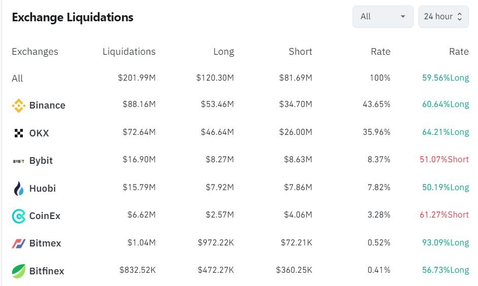 За последние 24 часа было ликвидировано 56 260 позиций трейдеров, общая сумма ликвидаций составила $201,99 млн.