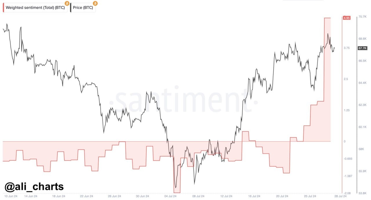 Соотношение положительных и отрицательных комментариев по отношению к BTC достигло самого высокого уровня с марта 2023 года, а исторический максимум снова показался на радарах.