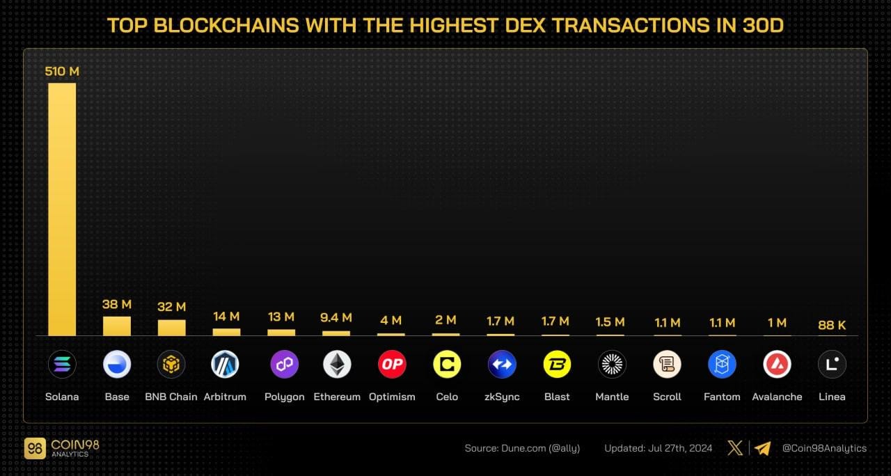 Solana лидирует с более чем 510 млн транзакций DEX, опережая другие популярные сети.
