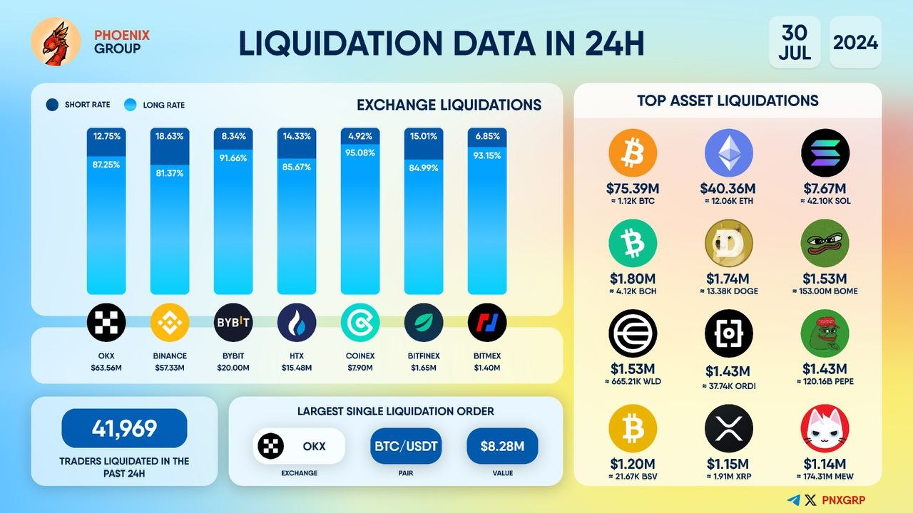 За последние 24 часа было ликвидировано 41 969 позиций трейдеров, общая сумма ликвидаций составила $168,73 млн.