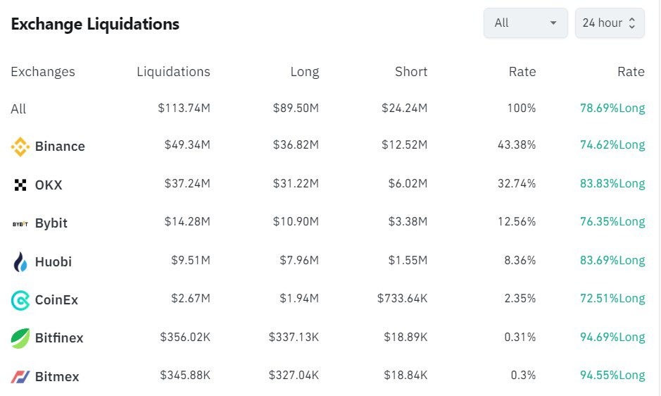 За последние 24 часа было ликвидировано 44 031 позиций трейдеров, общая сумма ликвидаций составила $113,74 млн.