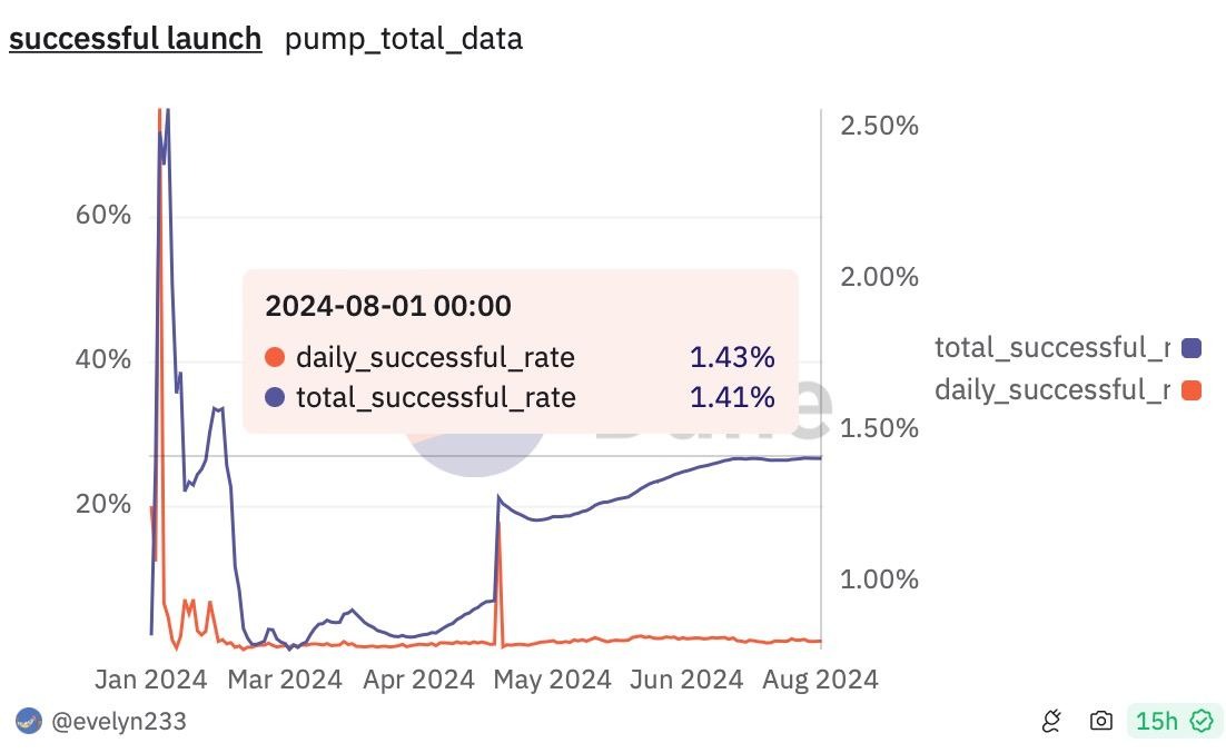 Согласно данным Dune Analytics, успешность крипто-токенов pump. fun, интегрированных с децентрализованным финансовым протоколом Raydium на платформе Solana, составляет 1,41%. С мая этот показатель колебался в пределах 1,21% и 1,41%. Исторический максимум в 2,56% был зафиксирован 16 февраля.