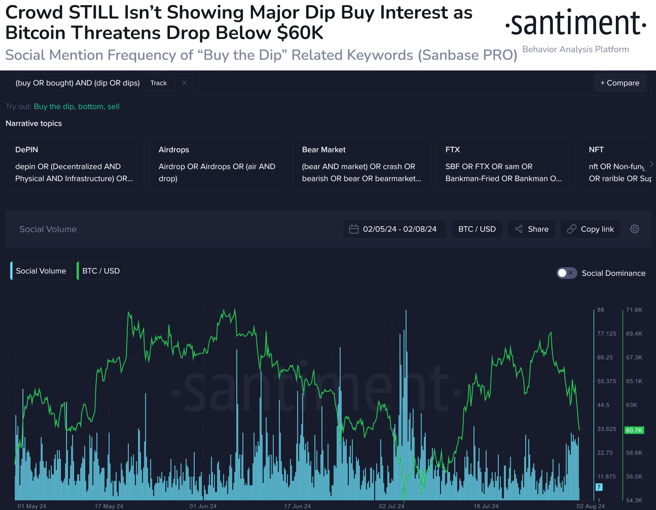 Поскольку это падение примерно соответствует тому, что мы видели в начале июля, тот же энтузиазм толпы к покупке на падении не присутствует... по крайней мере, пока. Ожидайте, что $60 000 BTC или $2 900 ETH станут ключевыми психологическими уровнями, которых может быть достаточно для трейдеров, чтобы начать покупку.