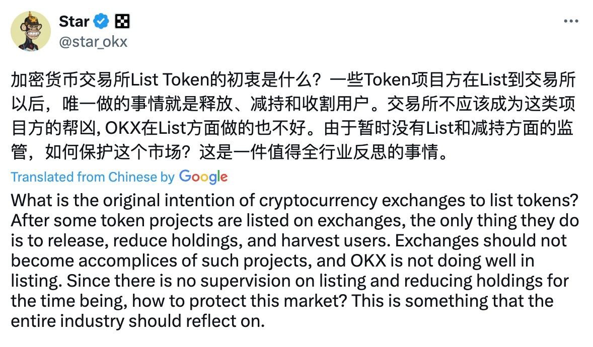Основатель OKX, Star Xu, отметил, что некоторые токены после листинга лишь распродаются, уменьшая свои активы и нанося ущерб пользователям. Биржи не должны становиться соучастниками таких схем. У OKX дела с листингом идут не очень хорошо. В настоящее время отсутствует контроль за процессом листинга и сокращением активов. Вся отрасль должна задуматься о способах защиты этого рынка.