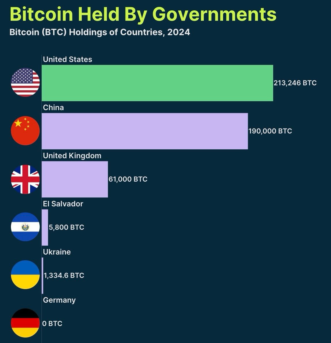 По состоянию на 29 июля 2024 года правительства по всему миру владеют 2,6% от оборотного предложения Bitcoin или 471 380,6 BTC на сумму $32,7 млрд.