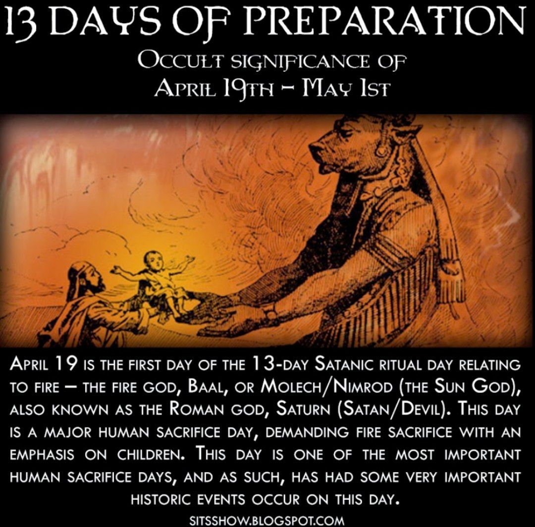The 13 days prior to and including May Day (April 19th- May 1st) consist of fire sacrifices to Moloch (aka Ba’al, Nimrod, Saturn, etc.), starting on April 19th. Knowing there are links of sacrificing children through fire to these pagan gods in our past, there is a disturbing coincidence of some mass murders committed in this time period involving fire & children. This includes the fire at the Branch Davidian Complex in Waco, Texas on April 19th, 1993, and also the Oklahoma City tragedy on April 19th, 1995. In fact, Timothy McVeigh cited the Waco incident in his reasons for committing the bombing at the Alfred Murrah Federal Building. Could these incidents all be tied together w/the sacrifices to Moloch in the valley of Gehenna? The Oklahoma City National Memorial was dedicated on the same date of April 19th, 2000 as well to commemorate the victims & annual services are ritually held at the same time & day annually (9:02 AM).  To add one more link into the mix, Tamerlan Tsarnaev (one of the Boston Marathon bombings suspects) was shot and killed on April 19th, 2013.