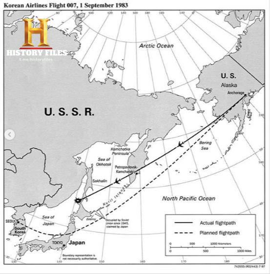 Полёт должен был проходить восточнее Камчатки, огибая территорию СССР, затем над Японией. Практически с самого начала лайнер стал отклоняться от курса. В это же время в воздухе находился самолёт-разведчик США Boeing RC-135, который шёл курсом на сближение с лайнером. Представленные позже советской стороной данные радиолокационных наблюдений показывали, что в определённый момент самолеты сблизились настолько, что их метки на экранах радаров слились. После этого один самолёт направился вглубь территории СССР, а другой — по маршруту, близкому к международной воздушной трассе. Вполне возможно, что станции советской ПВО с этого момента и далее вели гражданский лайнер как американский разведчик, чему способствовали сходные размеры и конструкция самолётов.⠀