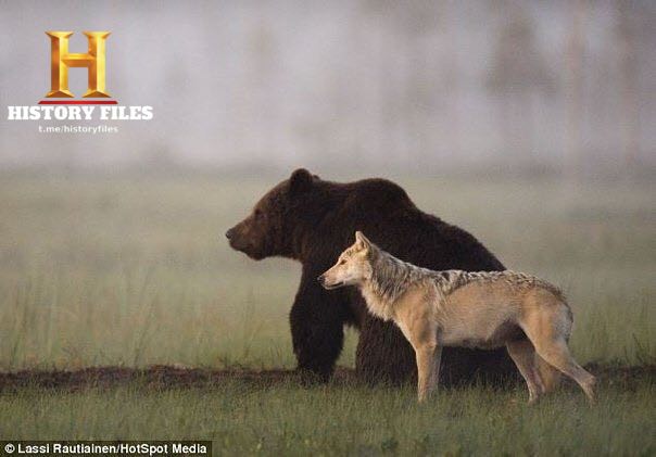 Эта фотография была сделана фотографом дикой природы Ласси Раутиайнену где-то в лесных дебрях Северной Финляндии. Он стал свидетелем необычной дружбы между молодым бурым медведем и волчицей. 56-летний фотограф на протяжении десяти дней наблюдал, как двое самых известных хищников, которые являются потенциальными конкурентами и даже врагами в условиях дикой природы, устраивали каждый вечер «романтические ужины», делясь, пойманной добычей друг с другом.