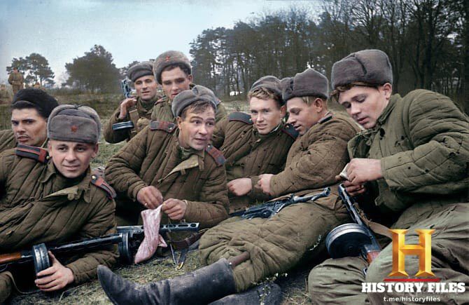 ⚡️На привале «Их ватные куртки были покрыты жиром и изношены ... это были, действительно, люди армий, которые сражались и избили две трети сухопутных войск Германии на Восточном фронте, в то время как великолепно оснащенные британцы и американцы имели достаточно проблем с другой третью в Нормандии, Италии и вдоль линии Зигфрида. Это были коренастые, черствые крестьяне и пастухи из степей. Они привыкли к трудностям», — описал победителей австралийский военный корреспондент Осмар Уайт.
