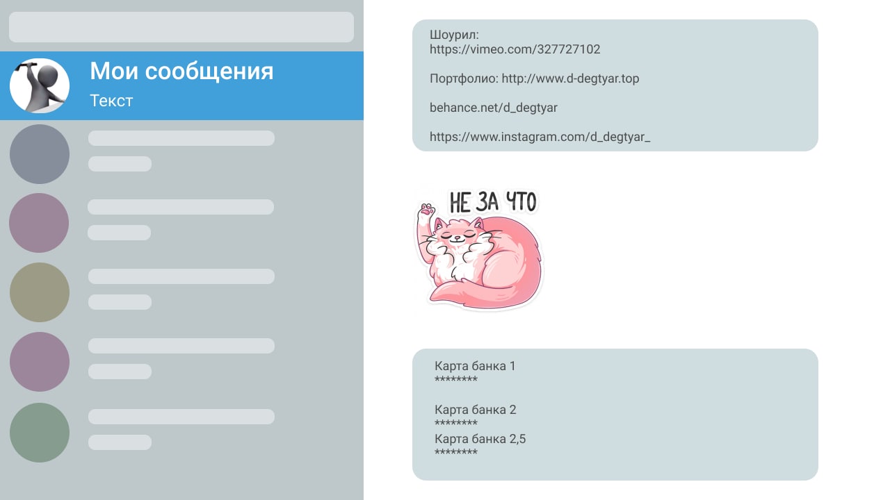 Телеграм основной мой канал коммуникации с клиентами. И типичное общение выглядит примерно так:
