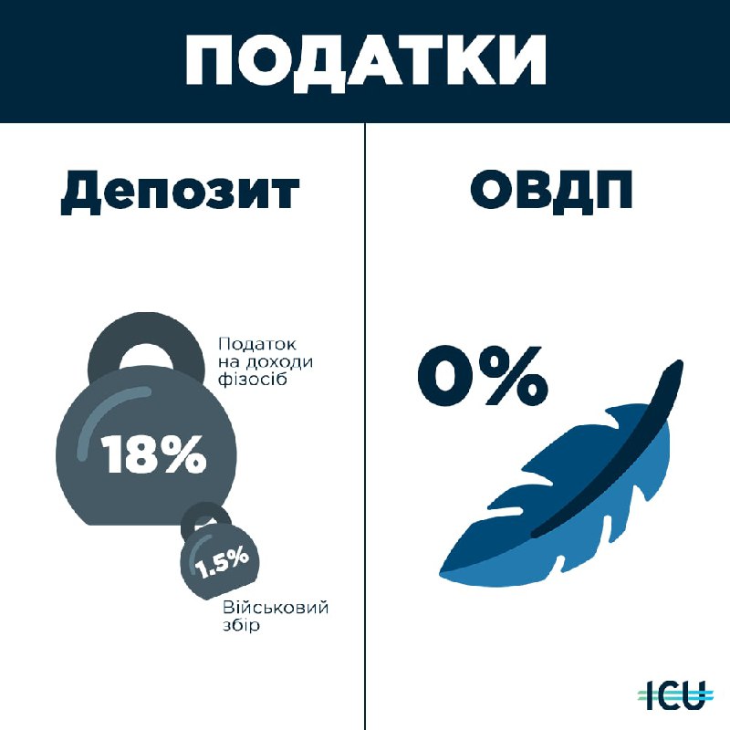 Беззаперечна перевага ОВДП — пільговий режим оподаткування. Державні облігації, на відміну від депозитів, звільнені від податку на доходи фізичних осіб та військового збору. Всі 100% доходу ваші.
