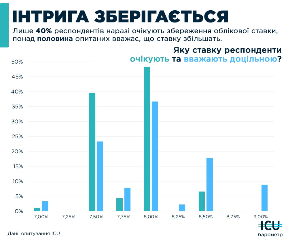 Майже 40% чекають, що НБУ продовжить перечікувати високу інфляцію зі ставкою 7.5%. Проте відчутно зросла частка тих, хто вважає, що регулятор почне відповідати на інфляційні процеси, - їх зараз понад 50%, більшість з яких очікує нову ставку на рівні 8%.