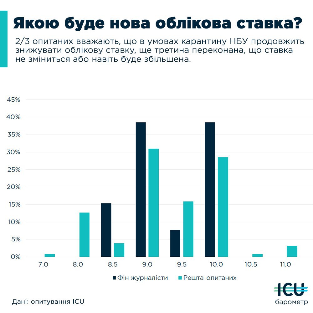 Перша в історії України облікова ставка в умовах карантину, на думку фінансової спільноти, буде зменшена. В цьому переконана більшість учасників #ICUбарометр, як серед профільних журналістів, так і серед усіх опитаних. Переважно очікують помірного зниження (0.5-1 в.п).