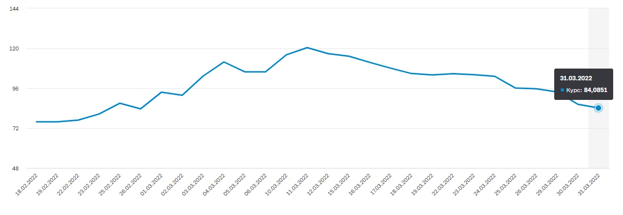 Офіційний курс долара до рубля вперше опустився до 84 рублів з початку вторгнення