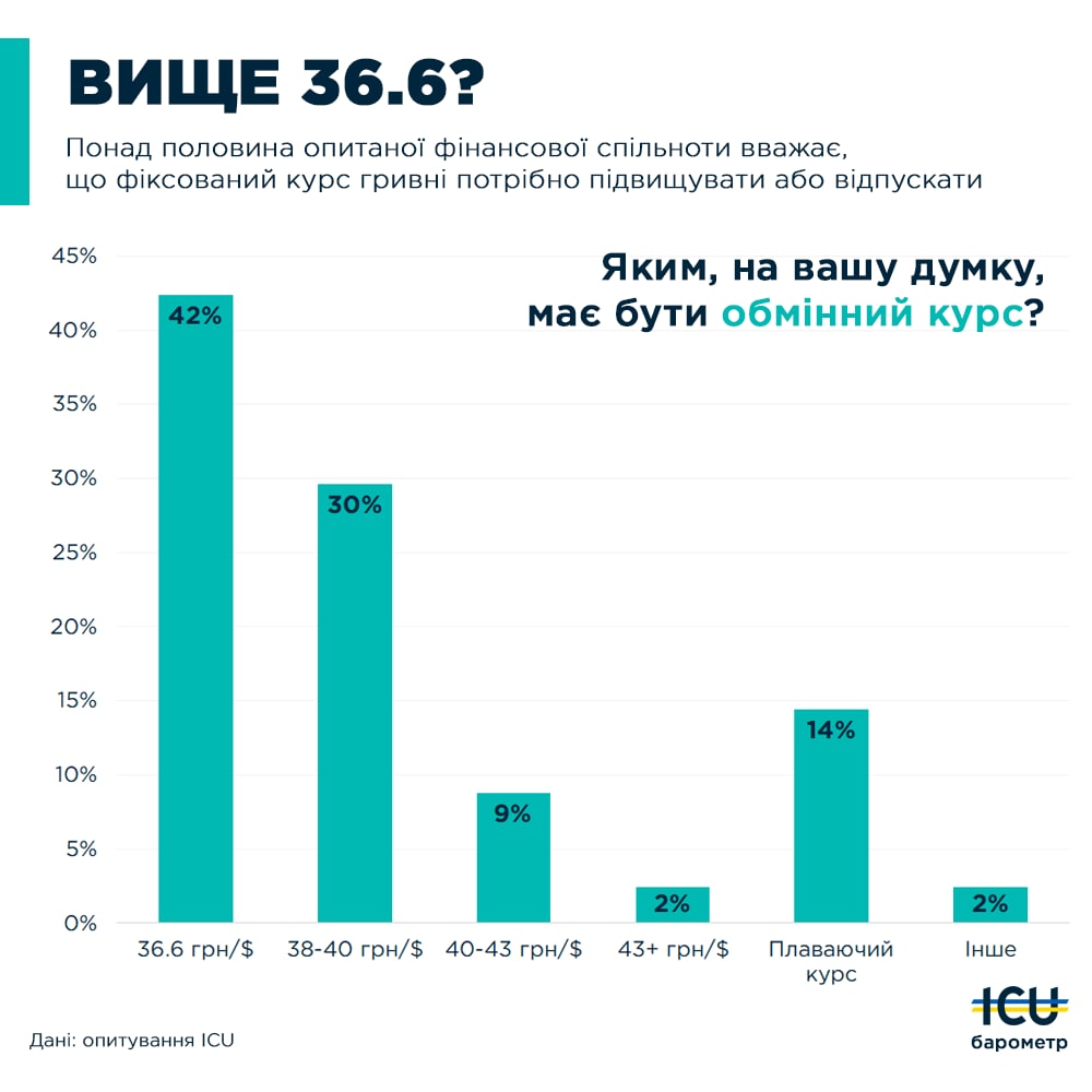 Набагато більш інтригуючі результати щодо питання по курсу. Відносна більшість опитаних 42% вважає, що "температуру" на валютному ринку варто тримати на 36.6 грн/$. Проте майже третина спільноти вважає, що курс має бути ближчим до вулиці, а ще понад 10% - що навіть вищим за поточні готівкові рівні. Ще майже 15% респондентів впевнені, що курс готовий до вільного плавання.