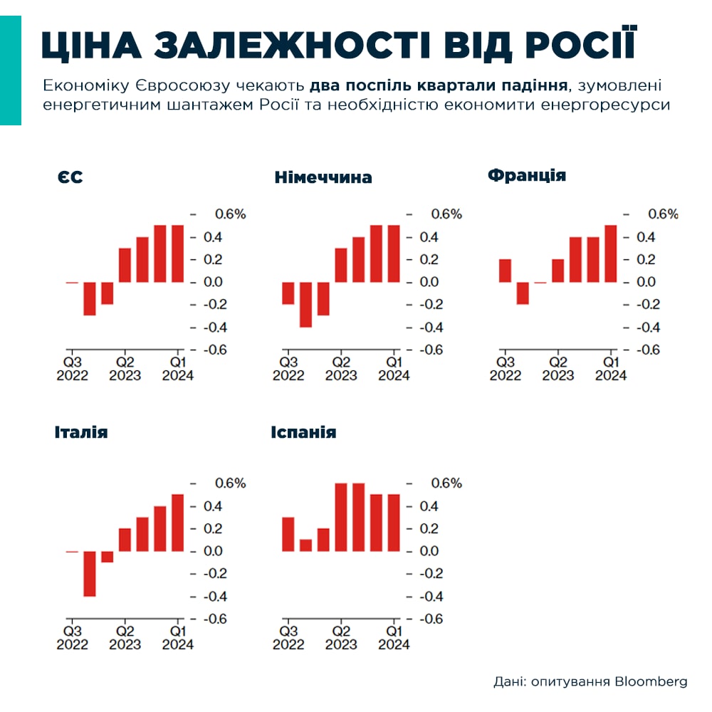 📉 Фахівці очікують мінімум два квартали падіння європейської економіки. Найсильніше рецесія вдарить по важковаговику європейської економіки - Німеччині, яка водночас найбільш залежна від постачання газу з росії.